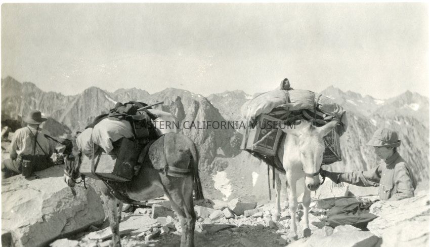 Identified by donor as: 1916 - Kearsarge Lakes, Kearsarge Pinnacles from top of Kearsarge Pass, unknown couple with burros