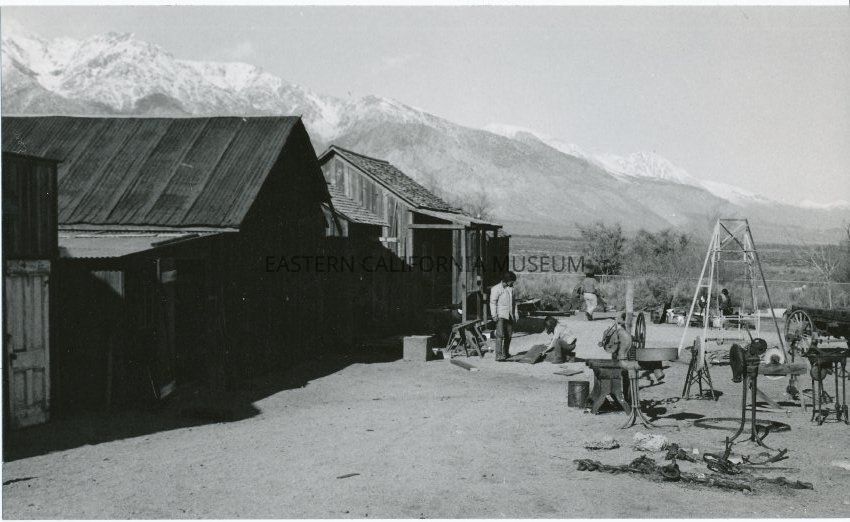 Location is outside on the grounds of the museum. Three wood structures on left side of image and partly in shadow. In foreground (lower right) are pieces of metal and tools on the ground. Standing just outside the fartherest building is a man lookng down at a women who is holding an oblong object. Behind them and is a man wearing a hat and is walking away from the camera and toward a line of brush and a fence. Background is open field and snowcapped mountains plus a cloudless sky.