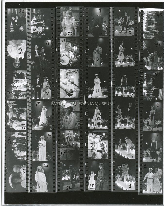 Proof sheet of six stripes of 35mm film in black and white. Each individual image has a number written in black marker. Example of marking is as follows - right hand side: 40,41,42 0,1,2. Number 40 is of a heavy set person on right side of stage talking into a microphone in their right hand. There is something white in their left hand. Audience (standing) in the background. Lights on stage floor.