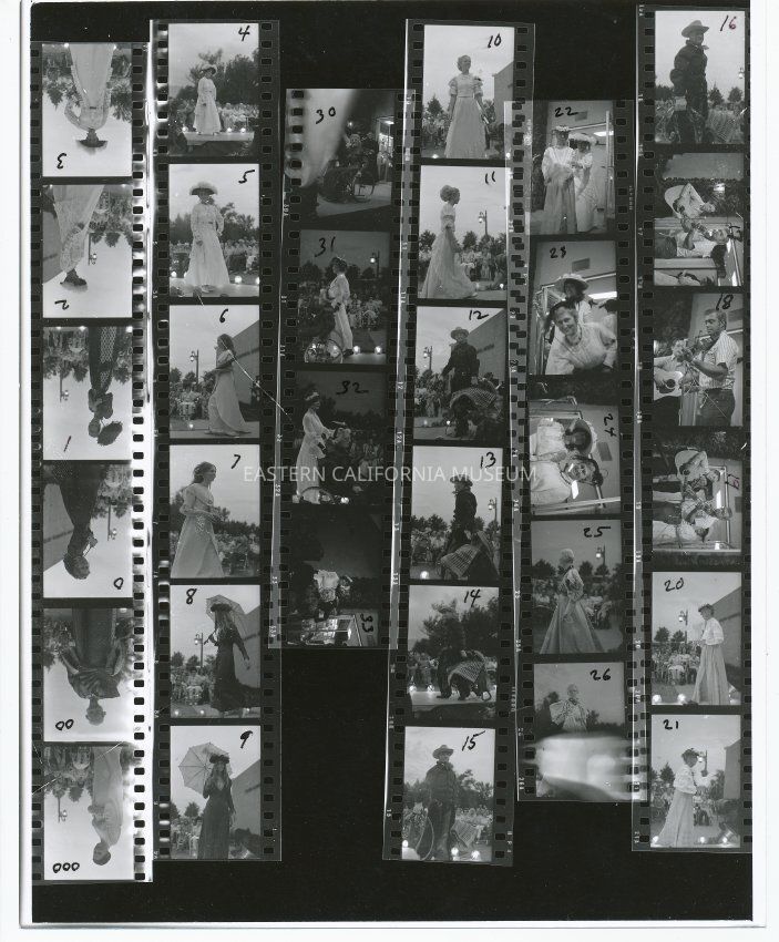 Proof sheet of six stripes of 35mm film in black and white. Each individual image has a number written in black marker. Example of marking is as follows - right hand side: 16.17,18,19,20,21. Number 16 is a standing half turned to the camera and holding a bridle in his gloved right hand. He is wearing a light colored cowboy hat, neckercheif and dark clothing. Audience is seated in background