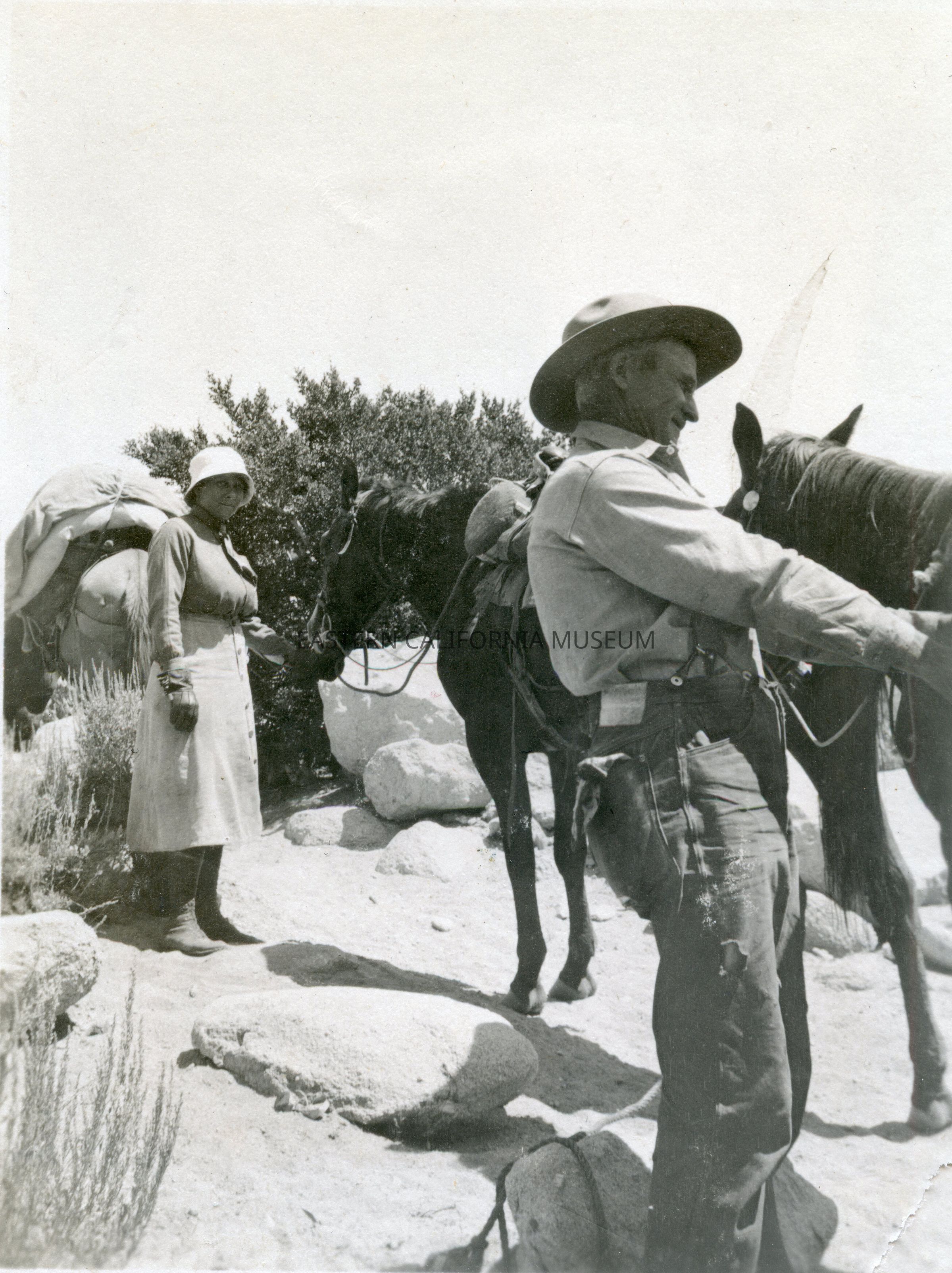 Photo of a man and woman with two horses and a pack mule. The man appears to be adjusting something on one of the horses as the woman looks on.