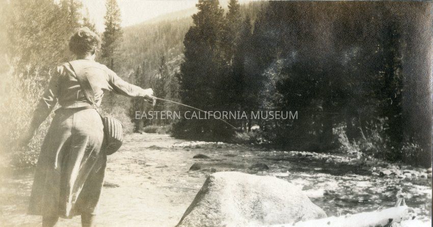 Photo of a woman fishing in a river. She has a fishing pole in her right hand and a creel across her chest.