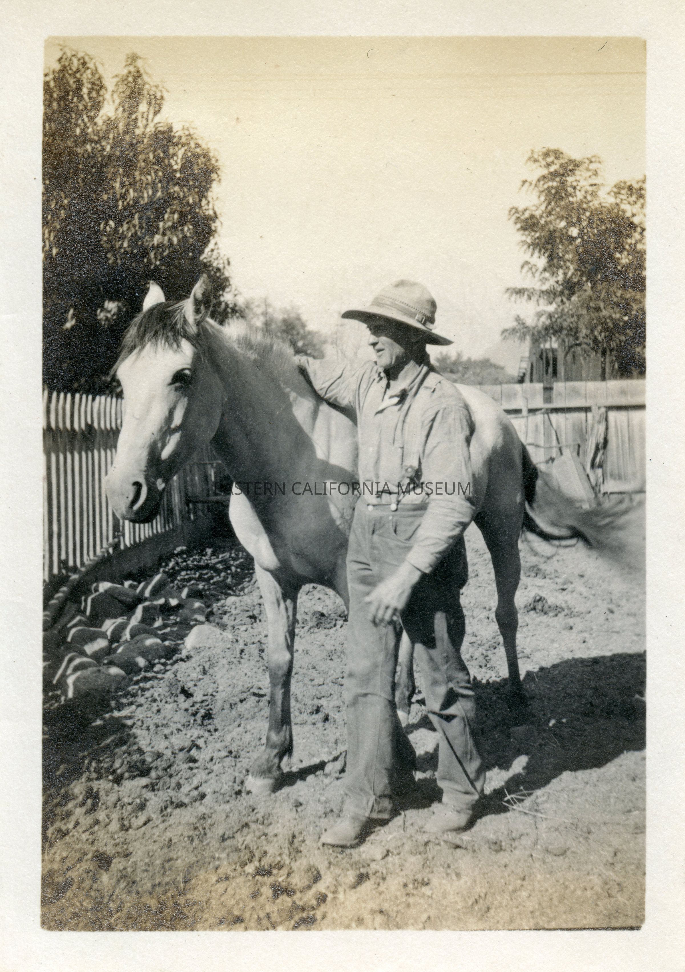 Photo of a man next to a horse. Appears to be at a ranch, corral, or stable as the space is enclosed by fences.