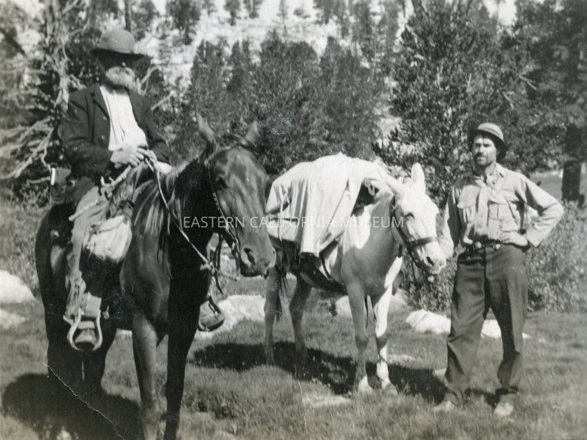 Photo of two men (one mounted, one standing), and a pack mule.