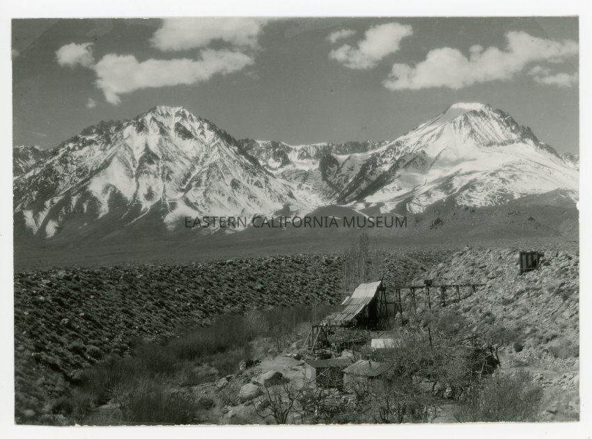 Photo of the Cometti Mine and Mill on Birch Creek out of Fish Springs in the Big Pine area. Birch Mountain is on right in background.