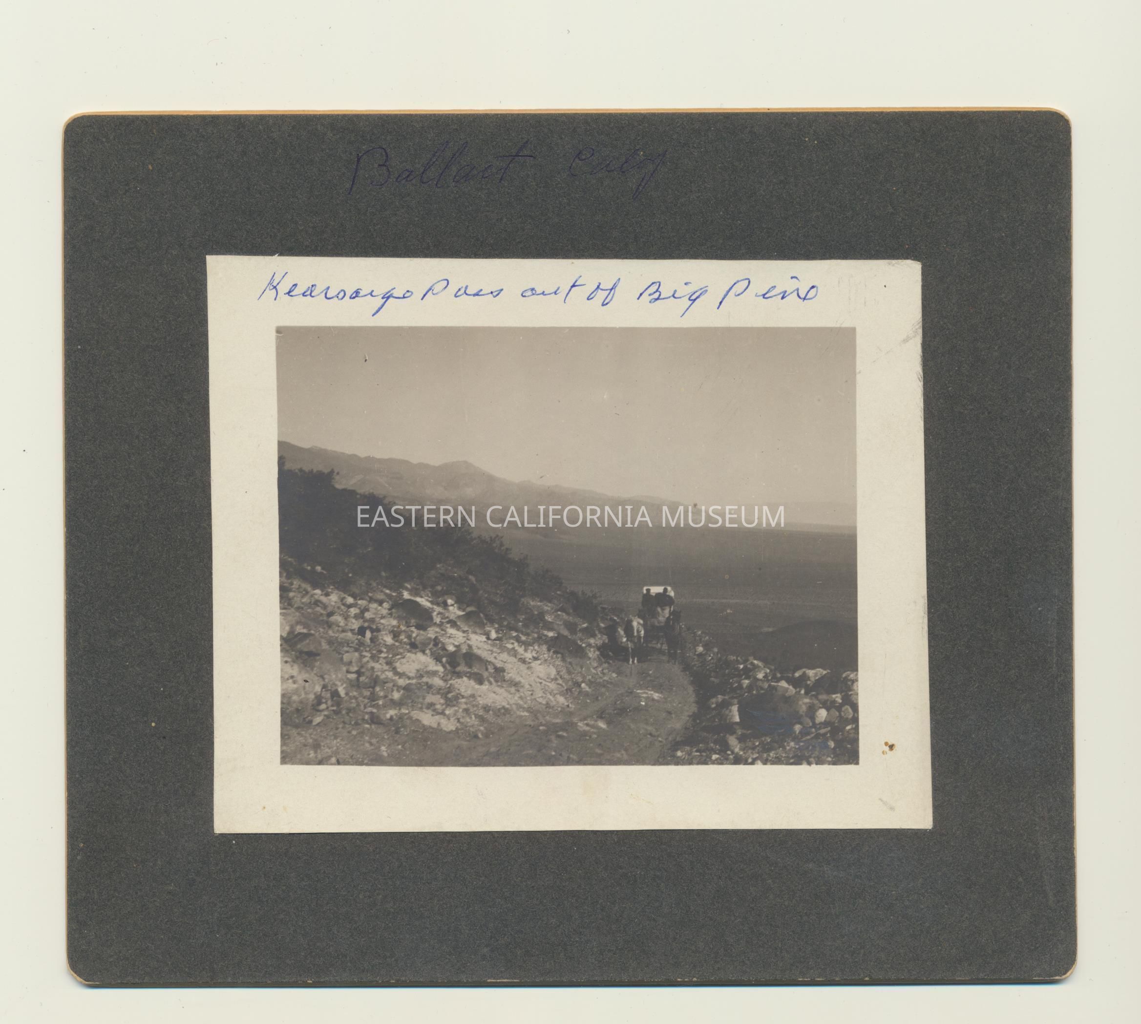 Mounted photo of a stagecoach coming around the corner toward the camera along a dirt road. There are mountains in the distance. Someone has written in blue ink above the image, "Kearsarge Pass out of Big Pine" and then above that on the mounting, "Ballarat, Calif." Suspect it is none of these locations, but rather possibly Panamint or Argus mountain ranges? The date of the photo may be circa 1907.Collection