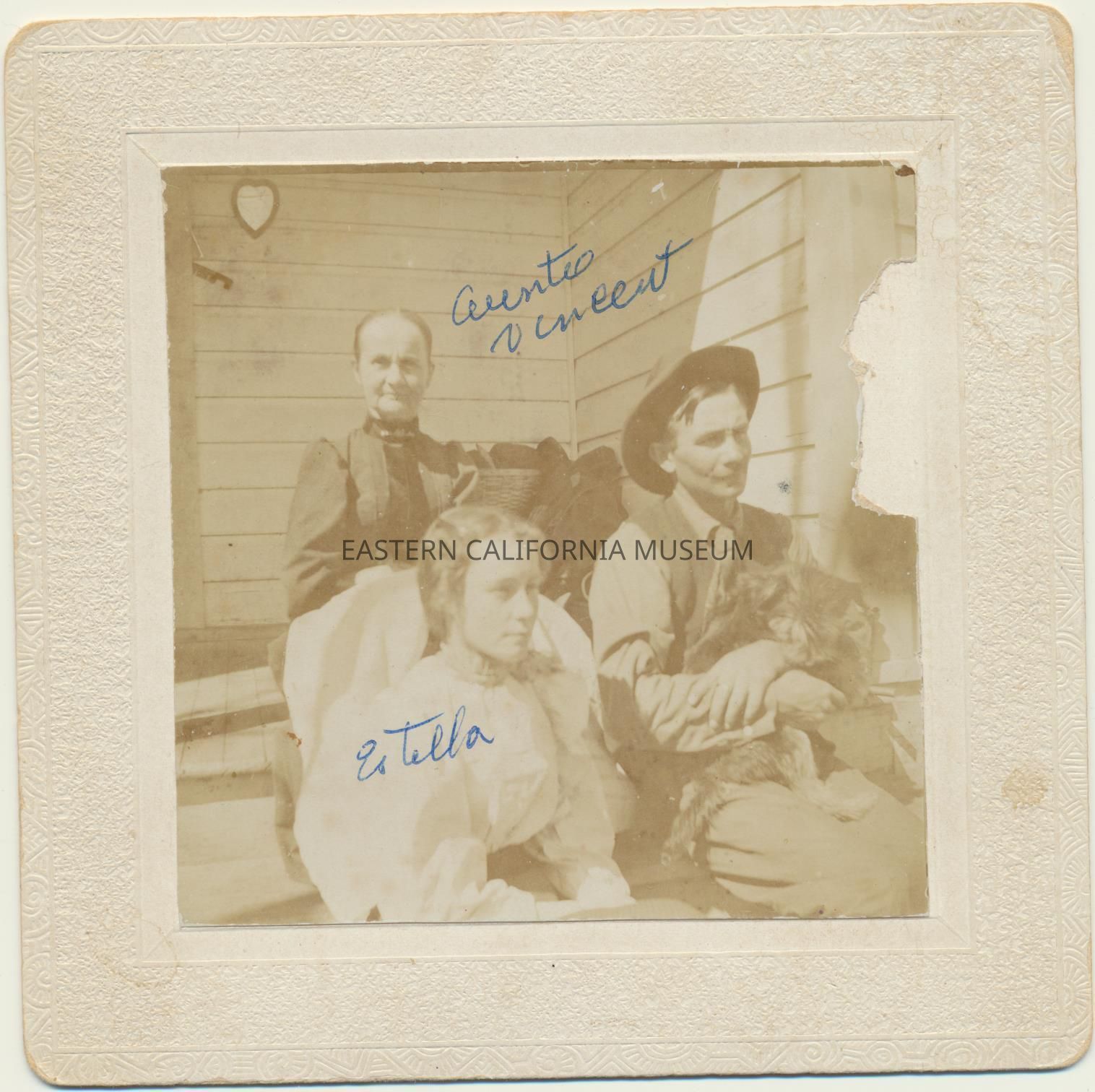 Mounted studio portrait of three people sitting on the steps outside a house. The older lady on top is identified as Aunt Vincent, the young woman sitting on the lower step is Estella Robinson Callaway, and the man on the right holding a small dog is Elijah Robinson. The photographer or previous owner may have been George S. Wood. Date of photo may be circa 1899.Collection