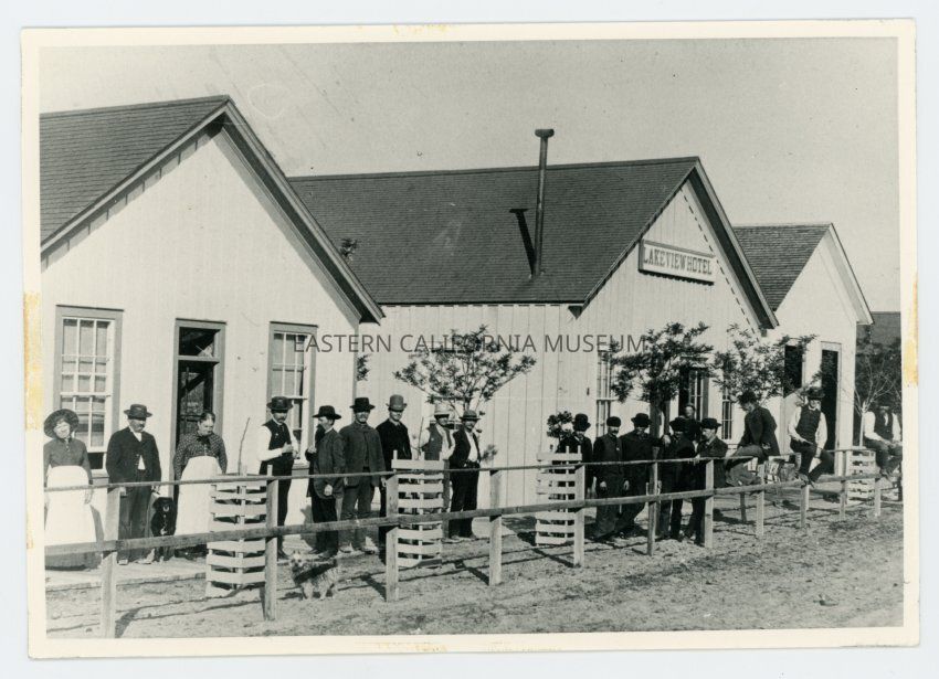 Photo of many people standing in front of the Lakeview Hotel in Keeler, in 1888 or 1889.