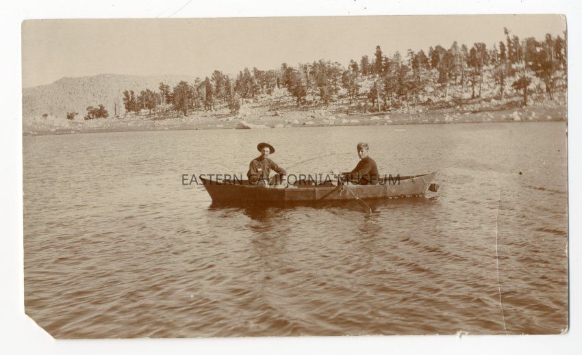 Photograph of two unidentified men in a canoe on a lake. One is holding a fishing pole and wearing a hat and the other is rowing the boat.