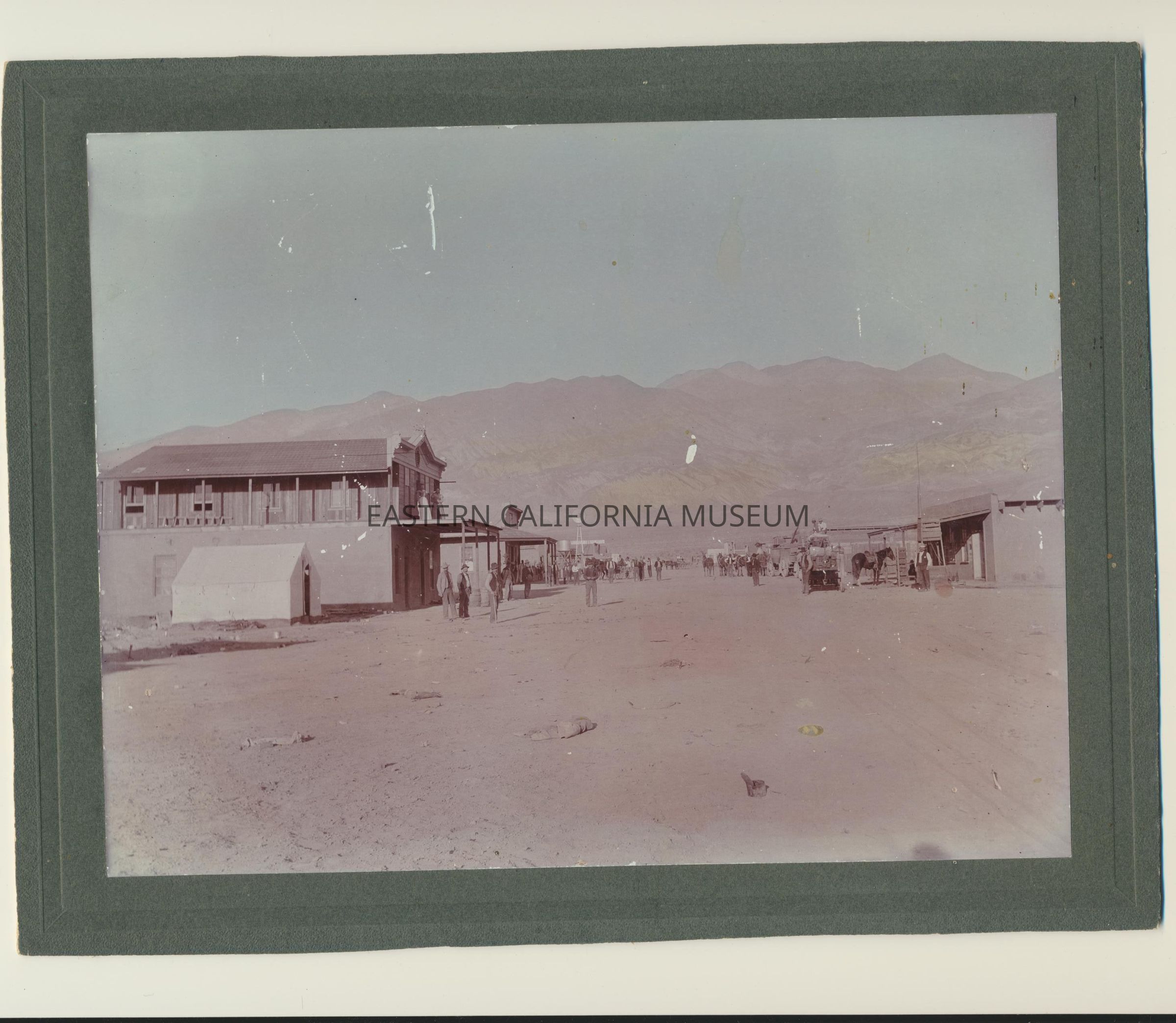 Mounted colored/tinted photo of a town, possibly Ballarat, CA around 1898. The Callaway Hotel may be in this photo.