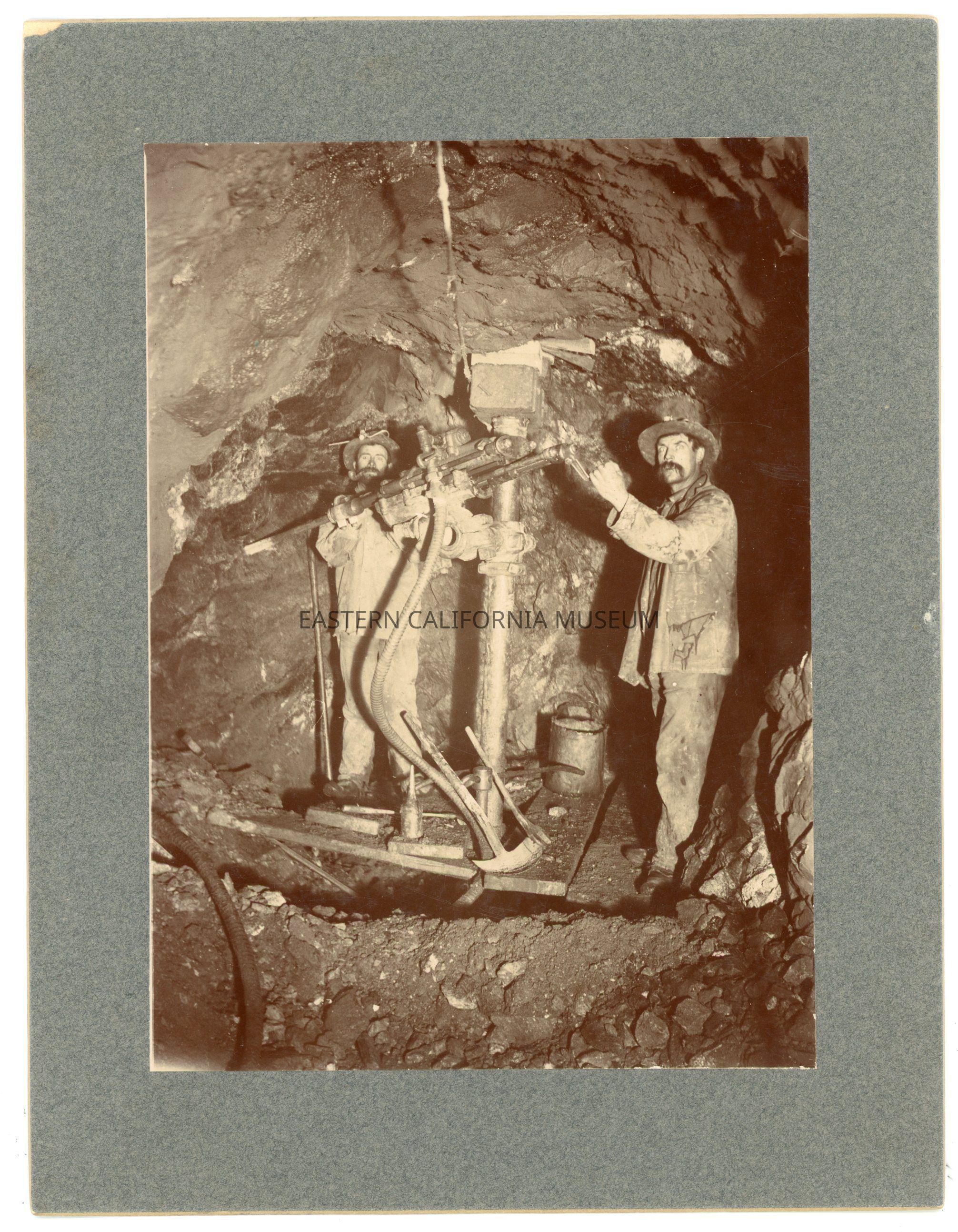 Mounted photo of two miners using a drill inside May Lundy Mine. Photo possibly circa 1900.