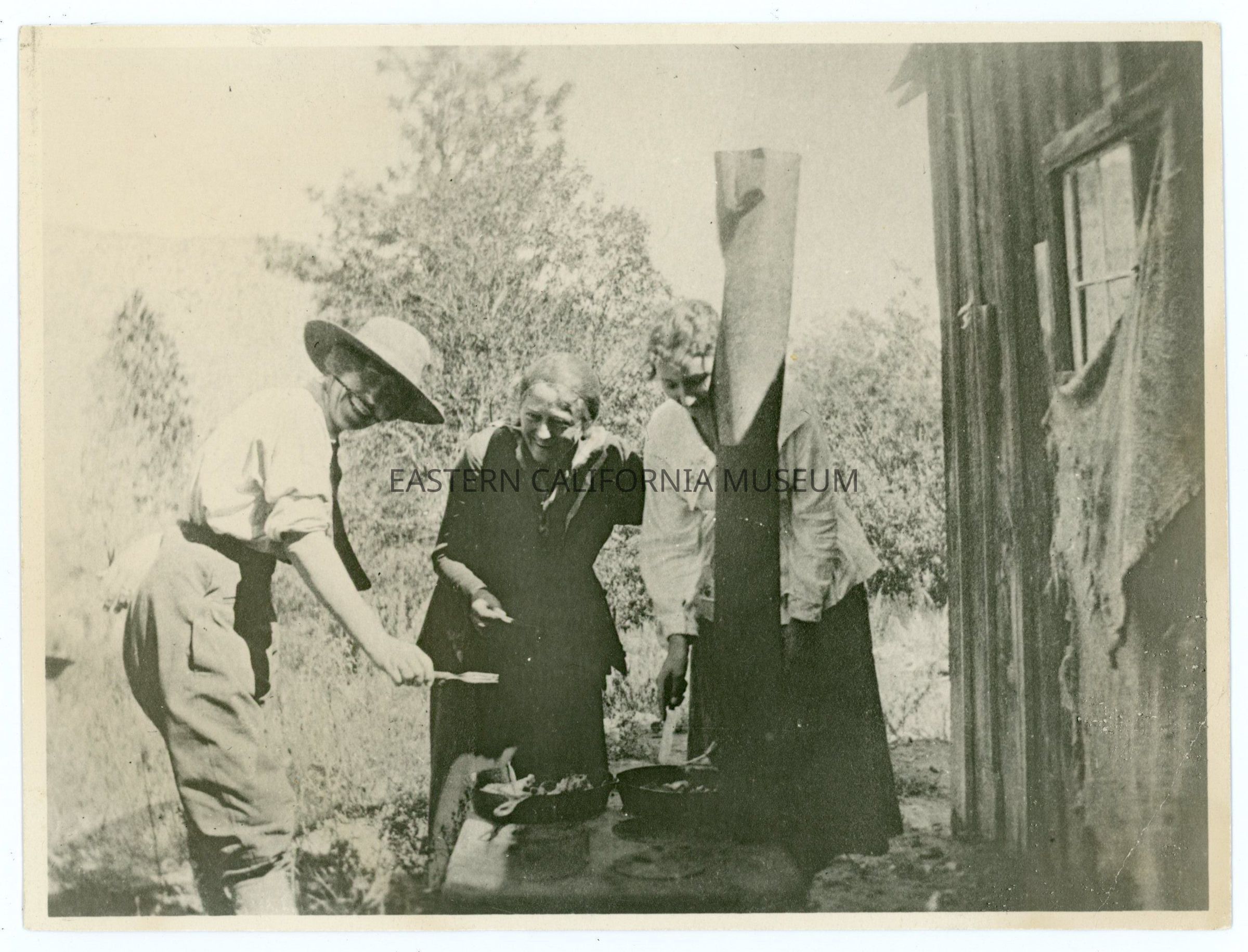 Written in pencil on reverse: Rosa Mairs, Mrs. IV Ershoots (Clara) Eibeshutz, Clara Logan. Old cabin at Gray's Meadows.Photograph Details