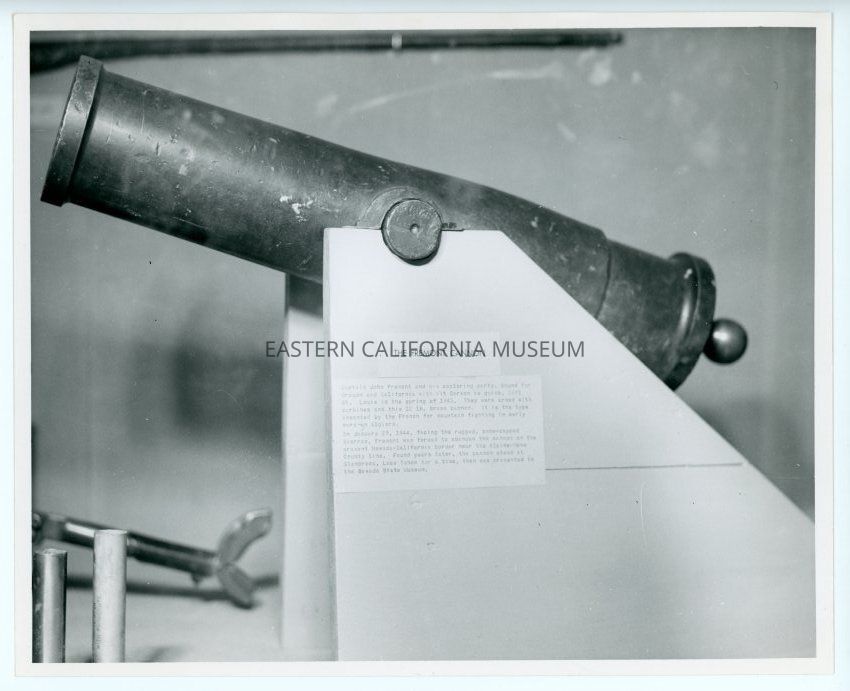 Photo of a Fremont cannon on display. Label says: "Captain John Fremont and his exploring party, bound for Oregon and California with Kit Carson as guide, left St. Louis in the spring of 1843. They were armed with carbines and this 12 lb. brass cannon. It is the type invented by the French for mountain fighting in early wars in Algiers. On January 29, 1844, facing the rugged, snow-capped Sierras, Fremont was forced to abandon the cannon on the present Nevada-California border near the Alpine-Mono County line. Found years later, the cannon stood at Glenbrook, Lake Tahoe for a time, then was presented to the Nevada State Museum."Collection