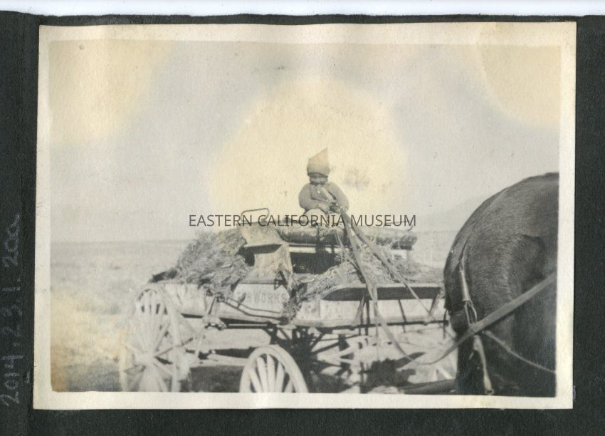 Small child sitting on a wagon holding the reins to a horse. Writing on side of wagon includes word, "works."