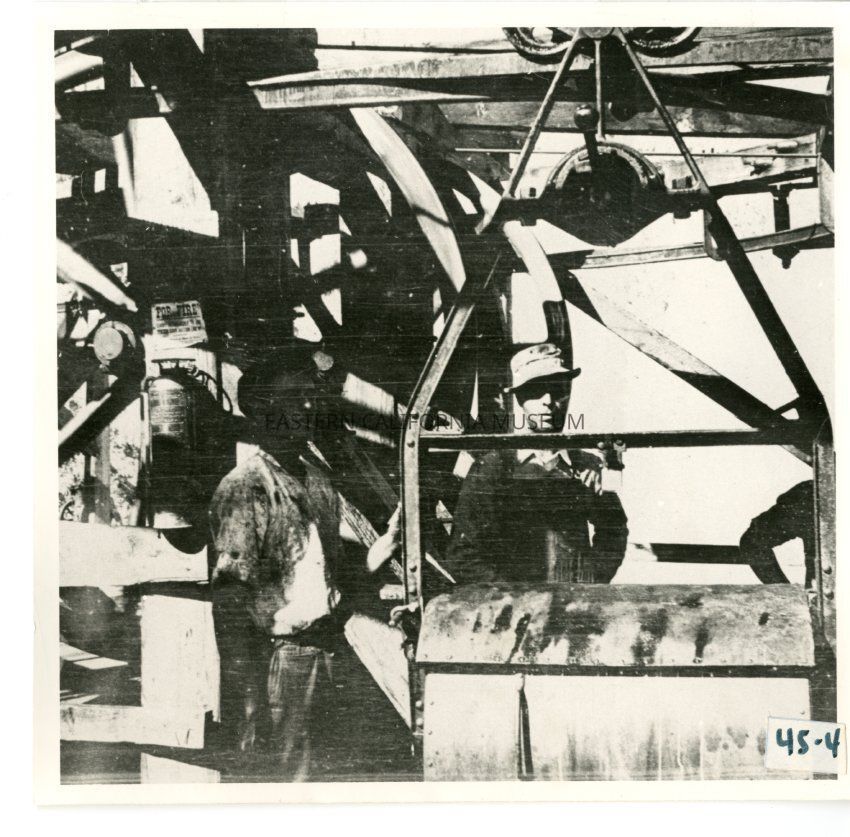 B/w photo of two men standing beside a bucket, likely in a tram station tower. There is a fire extinguisher behind them.