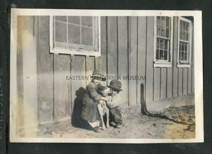 Two young children posing with the dog from MOORER 46 in front of a wooden building with several windows.