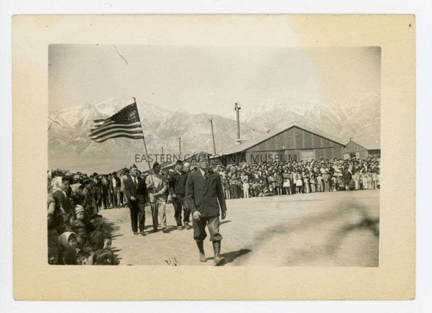 Black and white photo of an outdoor Memorial Day event at Manzanar War Relocation Center. Features four Japanese-American men (veterans?) carrying the American flag while a large crowd of Japanese-American internees observe. Barracks and Sierra Nevada mountains in background.