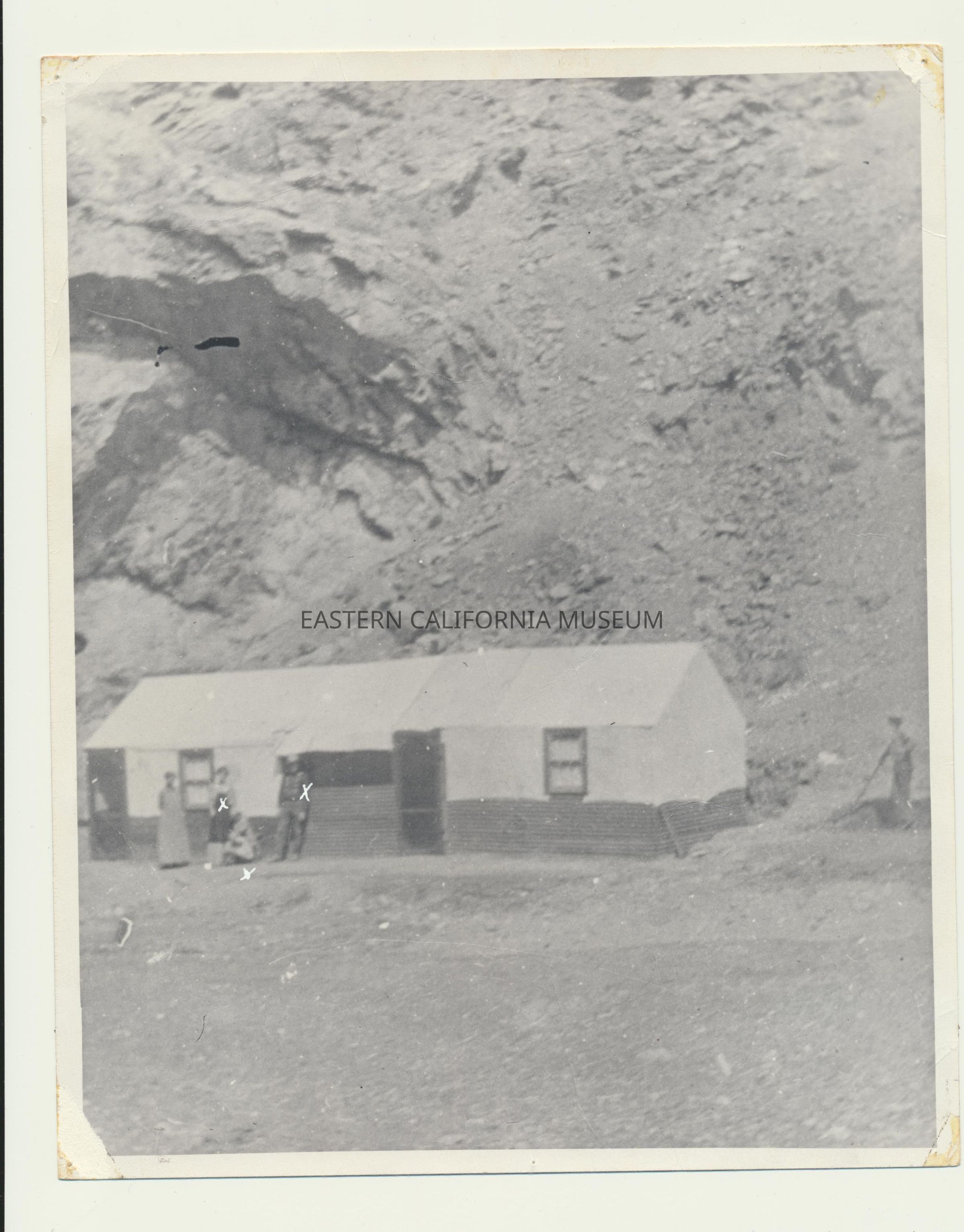 Piece of paper with additional information: Wild Rose Canyon, late 1906. John D. and Estella E. Callaway's stage stop with transfer for miners and their supplies. J. D. also had his six mule team and stage which he ran from Wild Rose Canyon to Skidoo and to other points in the area.Photograph Details
