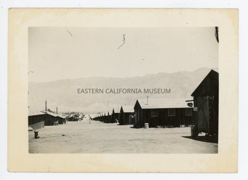 Black and white photo of a barrack-lined dirt street at Manzanar War Relocation Center. Sierra Nevada mountains in background. Writing on the back of the photo says, "Hiro Yamazaki". The barrack in the foreground seems to have a sign hanging from it (shaped like an artist's palette) and an address or label beneath it. Writing on envelope indicates that this is or may be Block 8, Building 15, but Manzanar ranger Rose Masters suggests that it may be Block 6, based on the number of barracks/blocks between the photographer and the mountains. This photo was likely taken during Memorial Day of 1942.