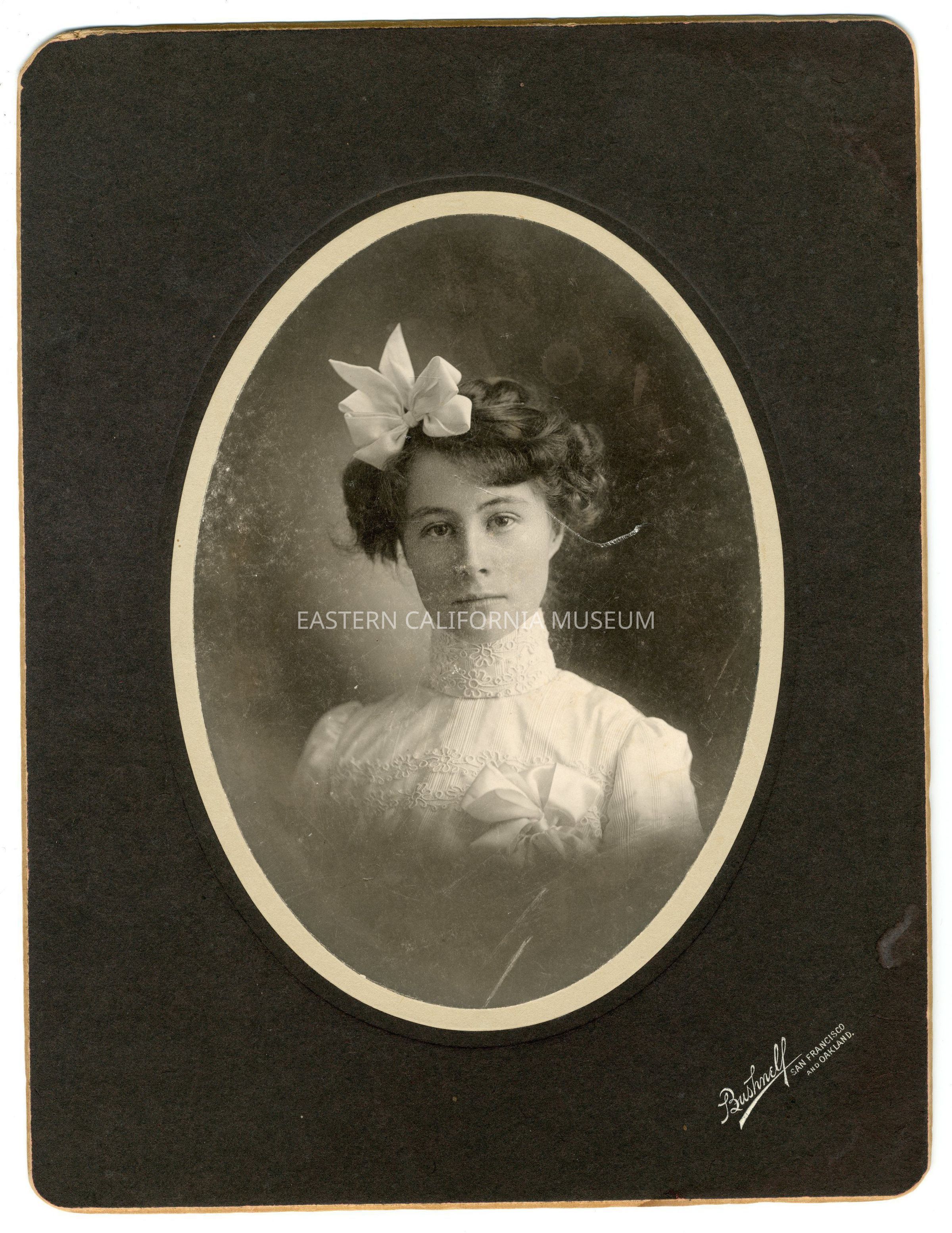 Large mounted studio portrait of Estella Robinson Callaway as a young woman. She is wearing a white dress with a high neckline, white bow in her hair, and another white bow on the dress. The photographer was Bushnell of San Francisco and Oakland.Collection