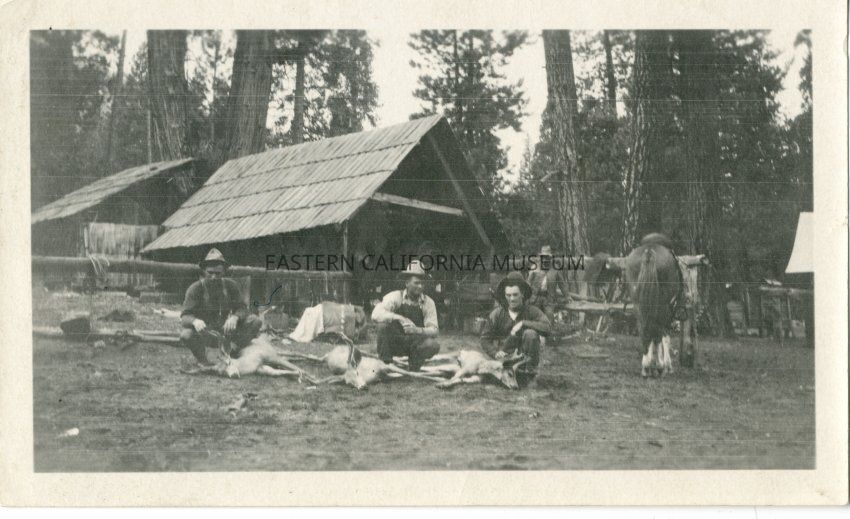 Sepia matte print: 3 men with the deer they bagged, cabin in background, horse tied to hitching post