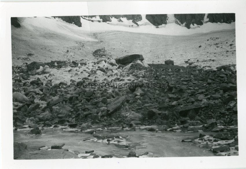 B&W glossy print: snow run-off below a glacier?