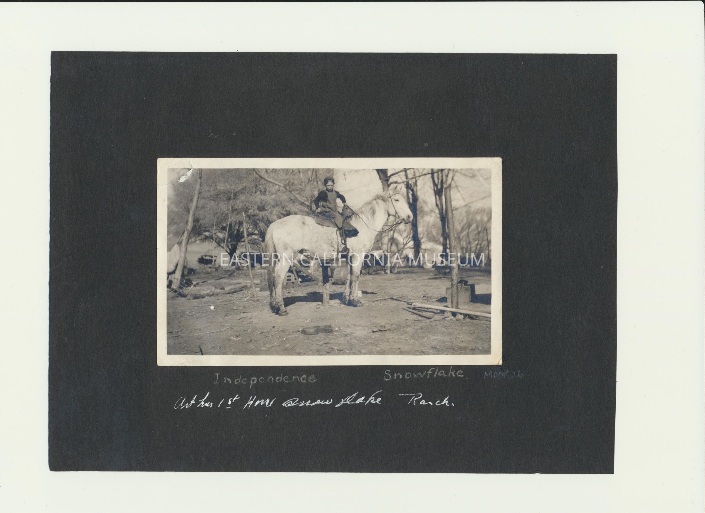 Photo affixed to a black album page of Arthur "Art" Callaway as a young boy on a white horse. It is labeled in white ink on the album page, "Arthur 1st horse, Snowflake, ranch." Added in pencil is, "Independence, Snowflake."