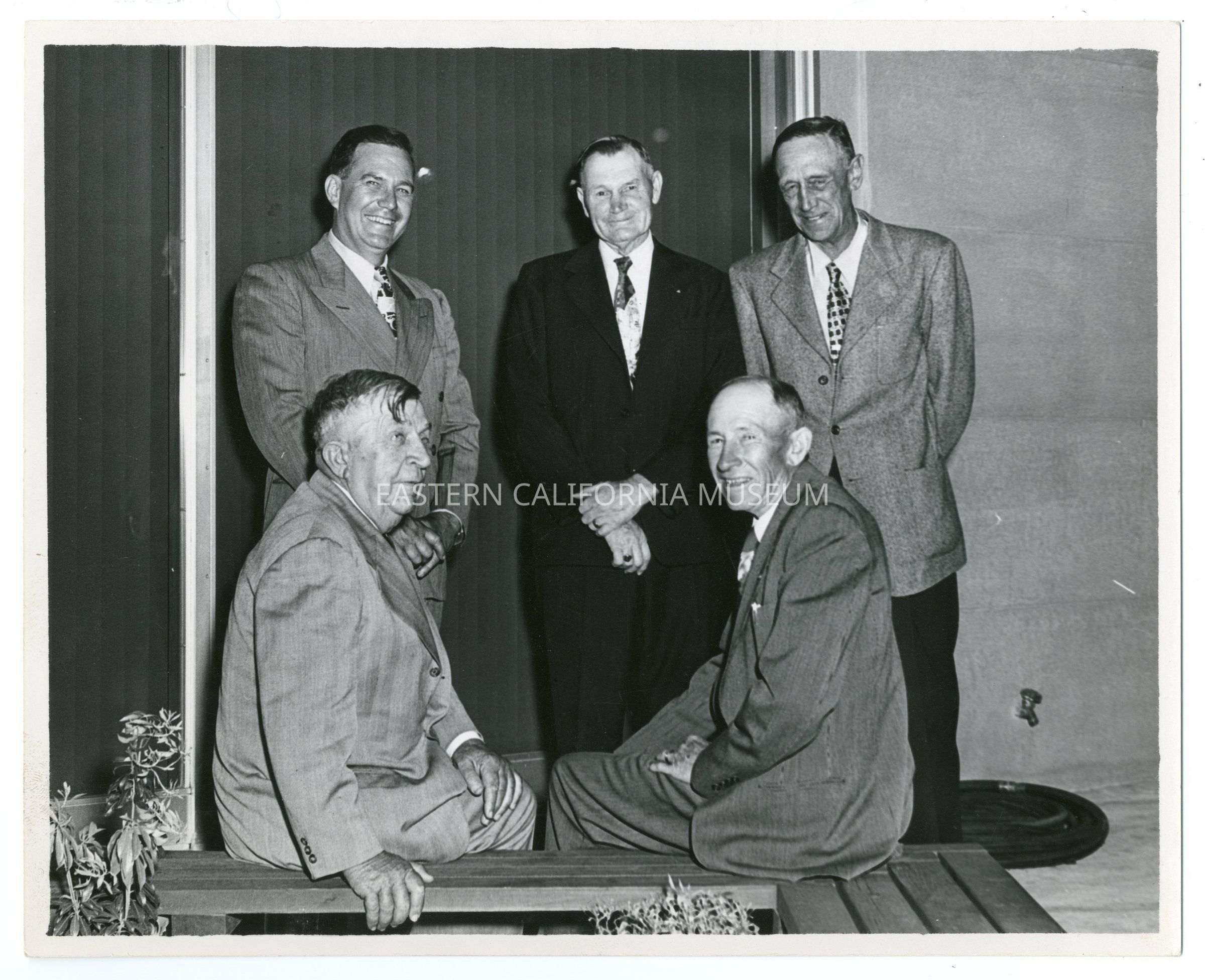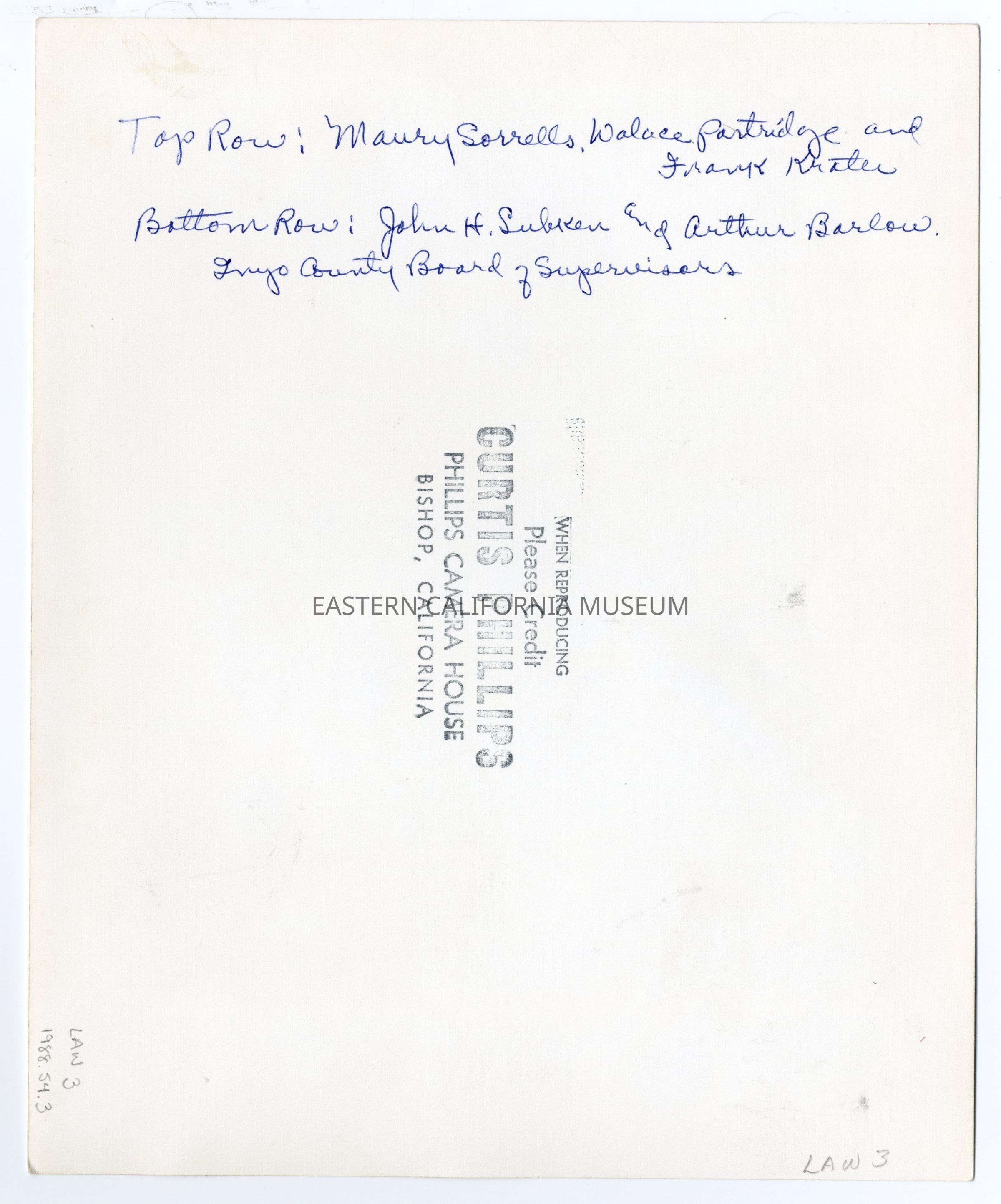 Written in blue ink on reverse: Top row: Maury Sorrells, Wallace Partridge, and Frank Krater. Bottom row: John H. Lubken and Arthur Barlow. Inyo County Board of Supervisors.