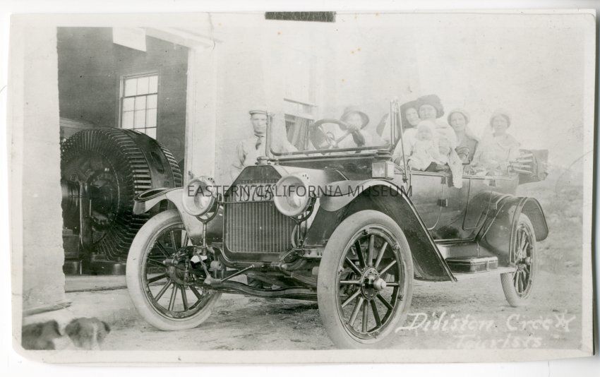 B&W. Front is labeled, "Division Creek Tourists." Photo of vehicle/car/automobile with a family of sight-seers. Appears to be Division Creek Power House in the background--machinery is visible to left. Dog in lower left. Young child is pretending to drive car.
