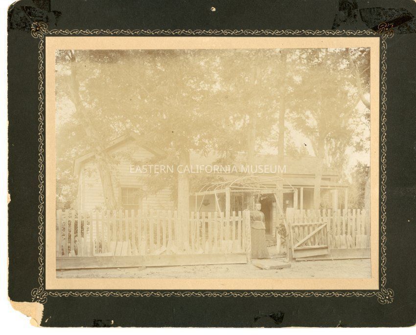 Mounted photo of an older woman standing in front of what has been identified as the Robinson house in Independence. Picket fence and trees in foreground, arbor between gate and house. Woman is wearing a striped skirt and a belted top.