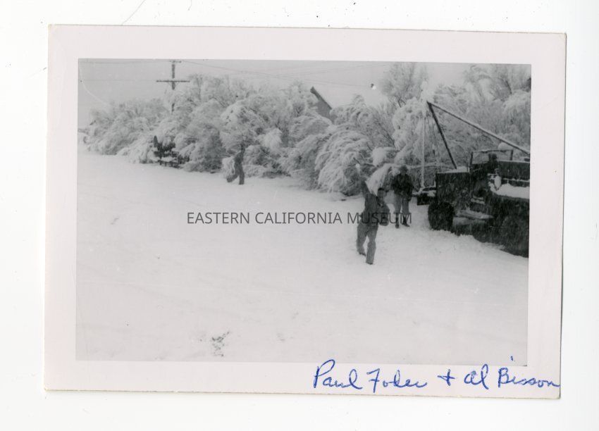 Photo of two men playing in snow. Another person is sitting in a truck on right side of photo, while a fourth person is walking near the tree line in middle-left of photo. Man in center throwing a snowball is labeled as "Paul Foder" and the other prominent male figure with his pant legs rolled up is labeled "Al Bisson."Collection