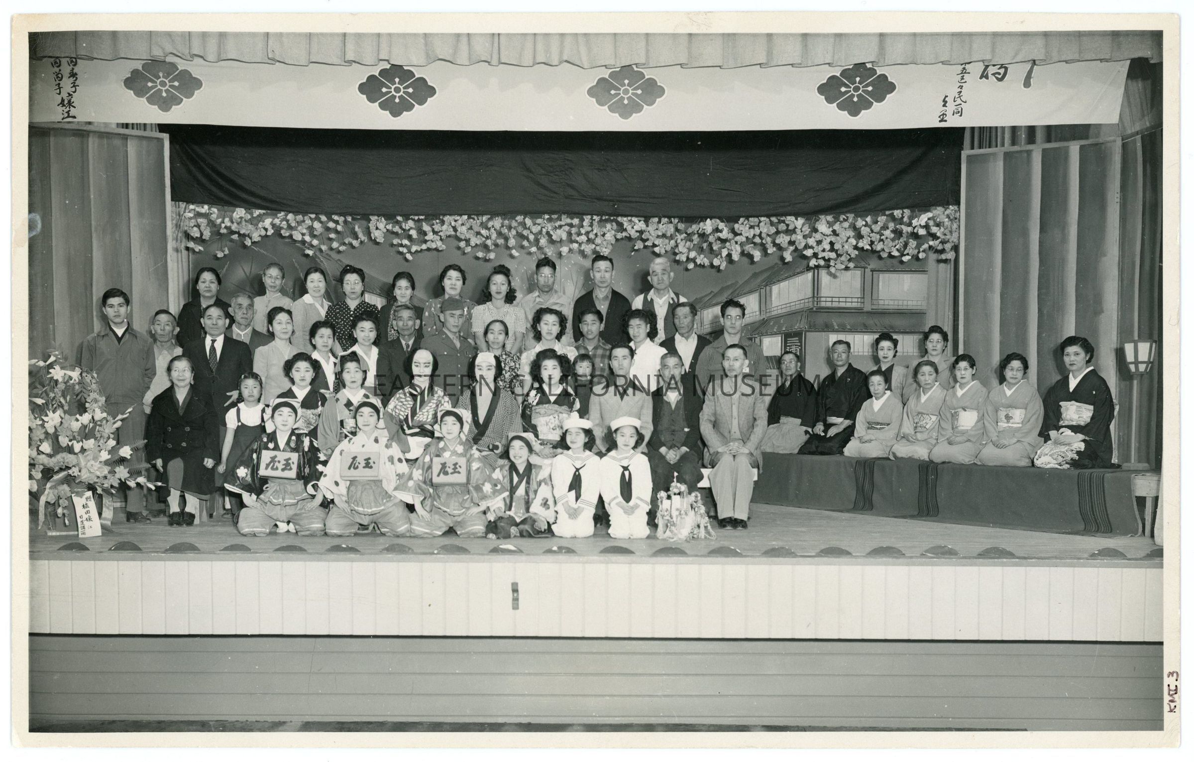 Group photograph on stage in Manzanar Auditorium of 51 people, male and female, ranging in age from a young girl to elderly men and women. Some are in traditional Japanese costumes, two girls are in white sailor suits, and some are wearing regular daily clothes. In the center of the photo is one young man in an army uniform. Behind the people on the stage appears to be a painted backdrop for a production with a building, tree, and flowers.