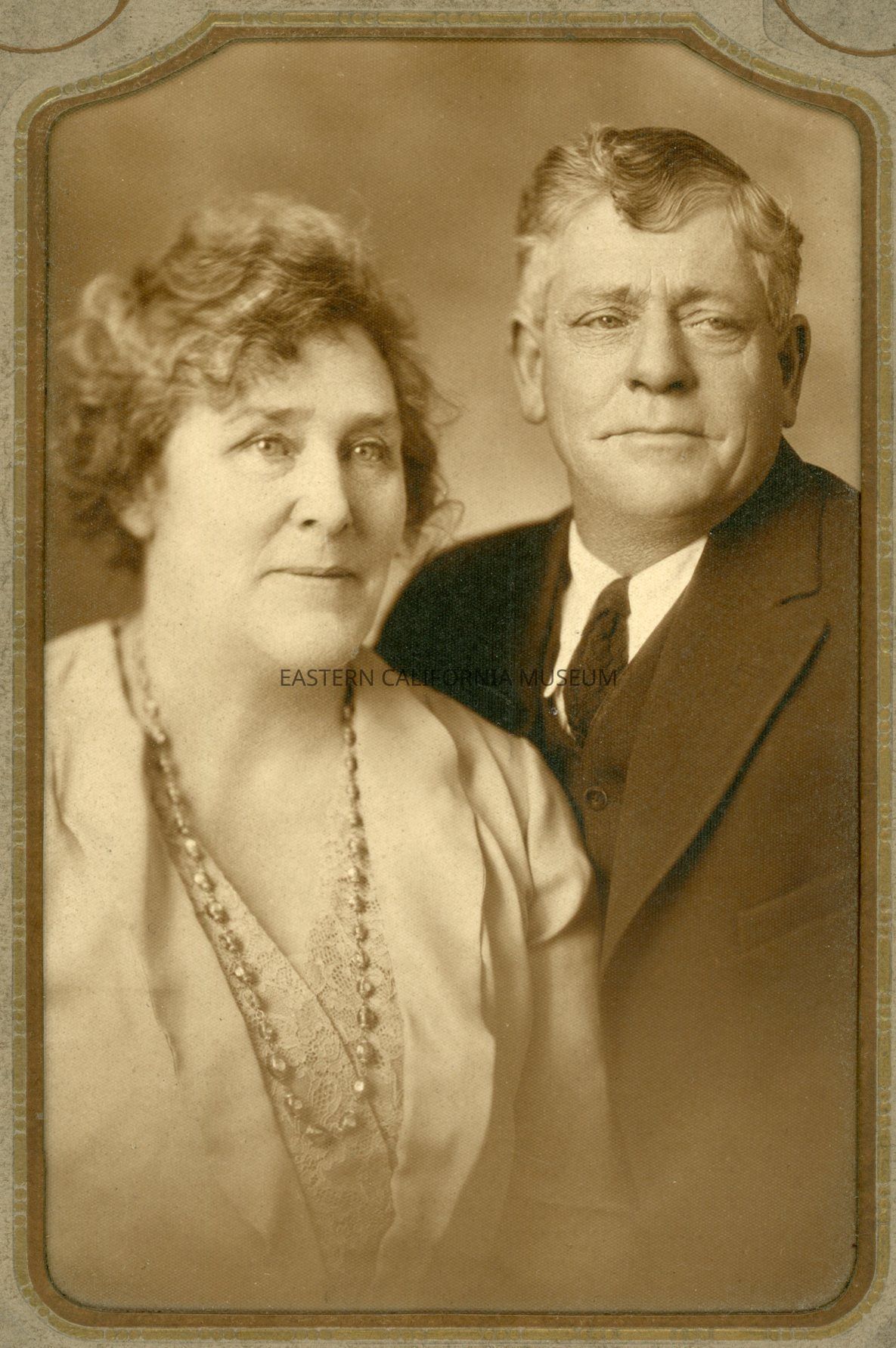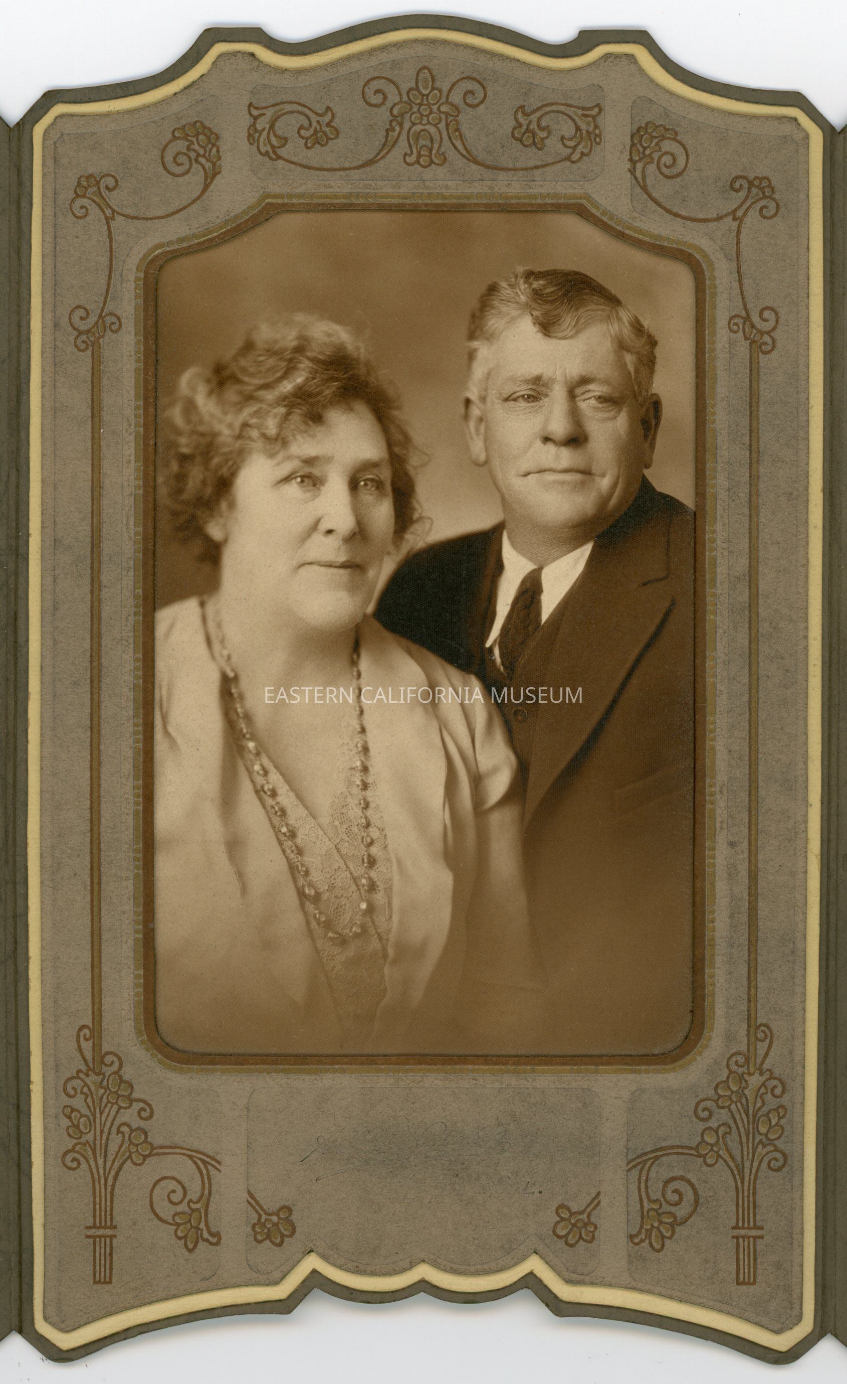 Mounted photo of a middle-aged woman and man. It was taken by Allan W. Ramsey of Lone Pine. It is housed in a very ornate, oriental-esque protective mat that has a patent date of 07/05/1927.
