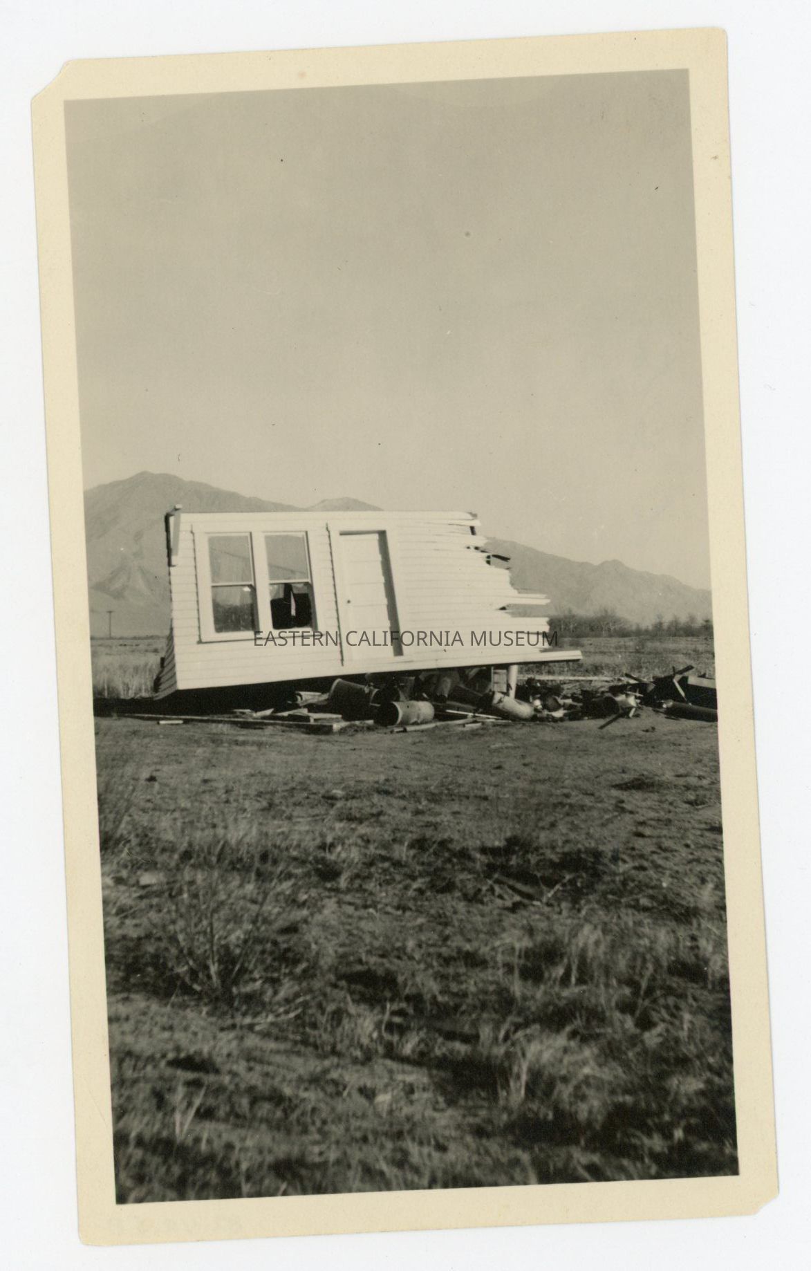 Photo of part of a house (a corner section) that has been ripped away. Location may be Manzanar, but uncertain.