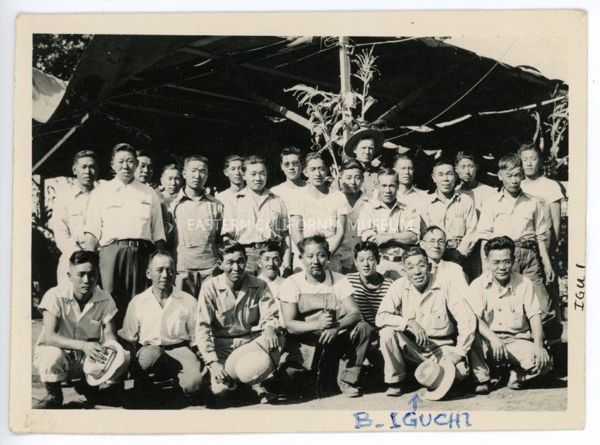 Black and white photo taken at the Manzanar Fair in 1943. The men are likely employees of the Farm Division. Mr. B. Iguchi is in the front row, second from right, holding a hat. The tent covering the farm produce exhibit is visible in background.Photograph Details