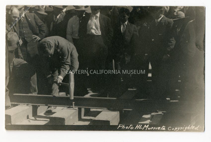 Photo postcard of man driving spike into railroad track as a crowd looks. It was taken by photographer H. L. Murrieta.