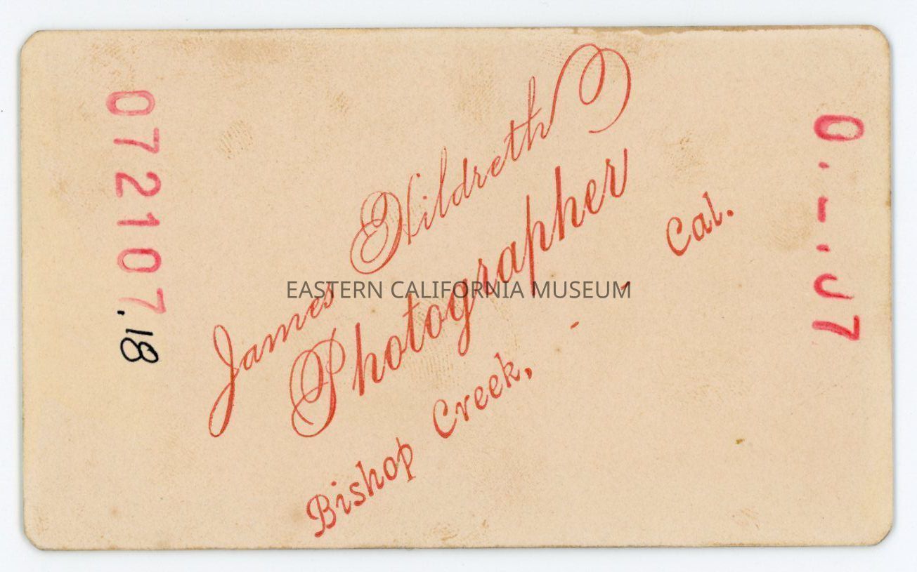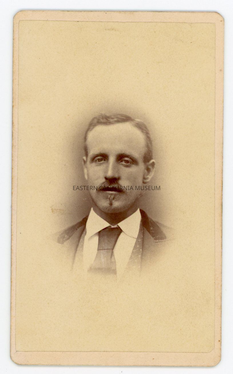 Mounted bust-length studio photo of an unidentified man. He has light hair, a moustache and goatee, and is wearing a tie with a wide, flat knot. It was taken by photographer James Hildreth of Bishop Creek, likely between 1879-1881.