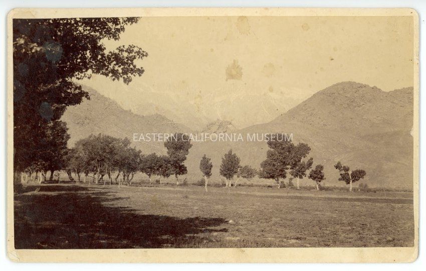 Mounted photograph of the north field of the Edwards Ranch, which originally belonged to Charles D. Begole, circa 1886. Possibly a view of Alabama Hills and Mt. Whitney? Photographer was James H. Crockwell from Salt Lake City, Utah.