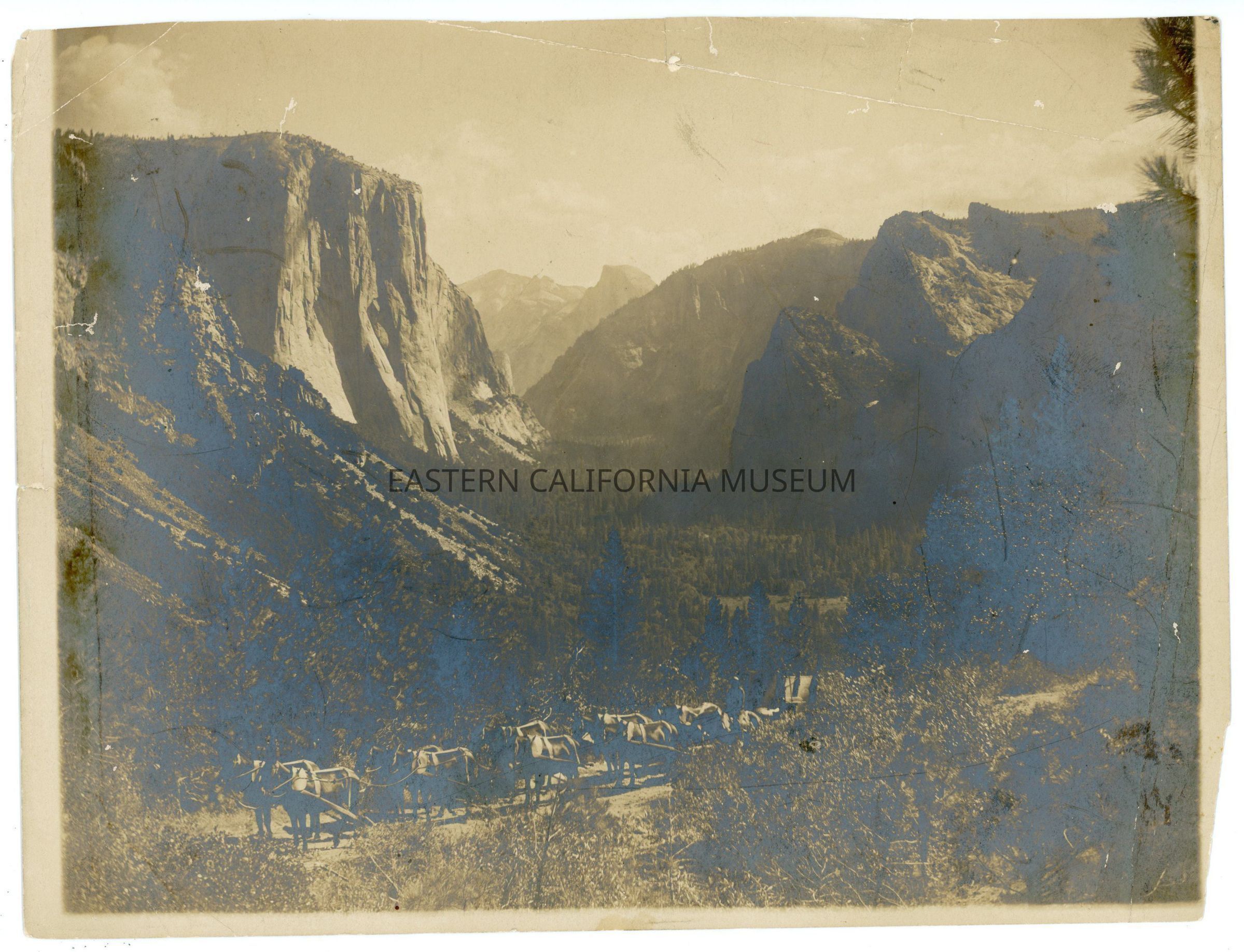 Photo of a ten mule team and wagon in Yosemite Valley. Half Dome is visible in the background.