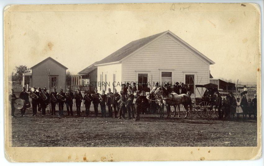 Mounted photo of the Independence Silver Cornet Band. Also visible in photo is a horse and buggy, house, and several children on right side.