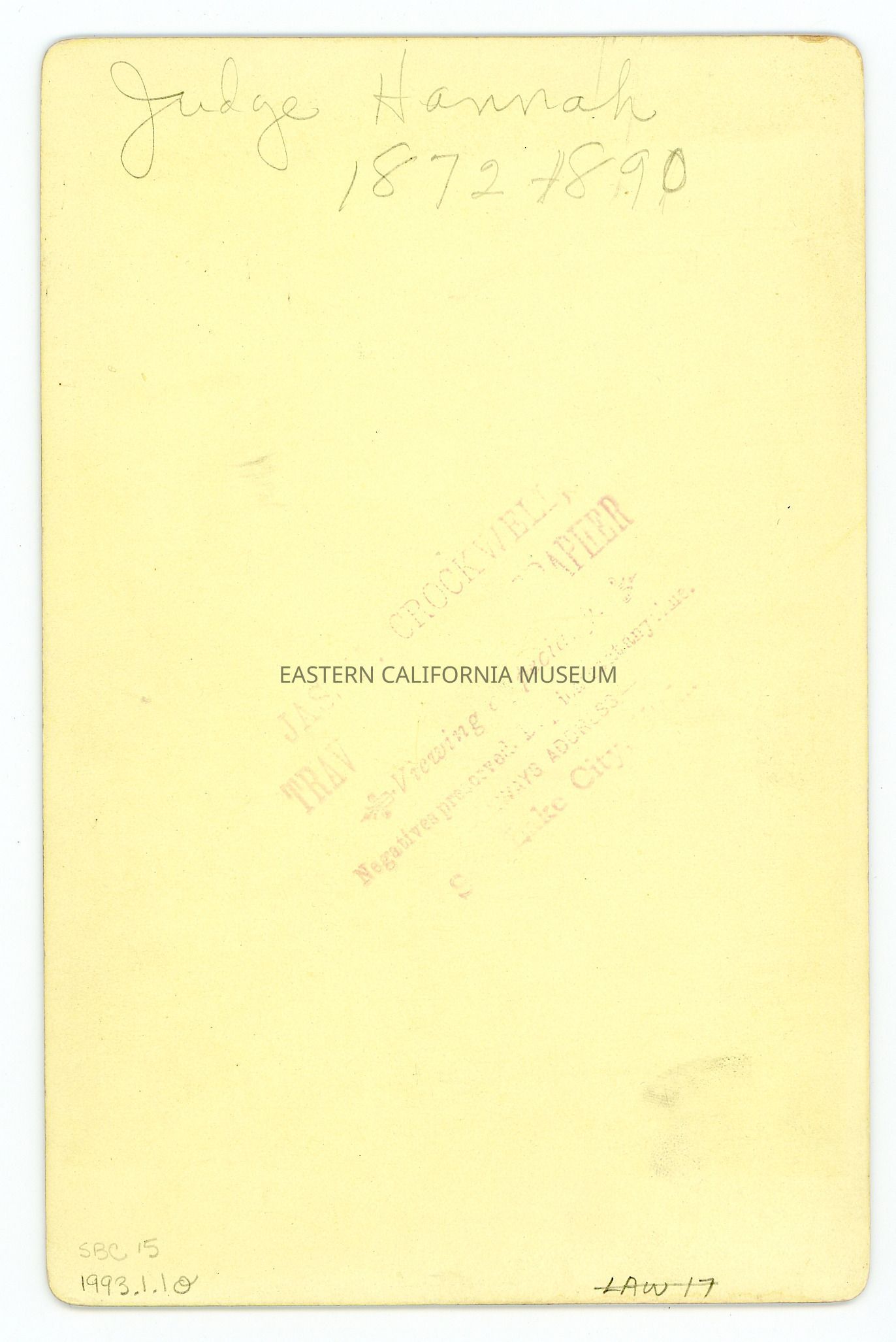 Mounted bust-length studio portrait of Judge John Hannah. He was an Inyo County Judge from 1872-1890. Photographer was Jas. H. Crockwell of Salt Lake City, UT.Collection