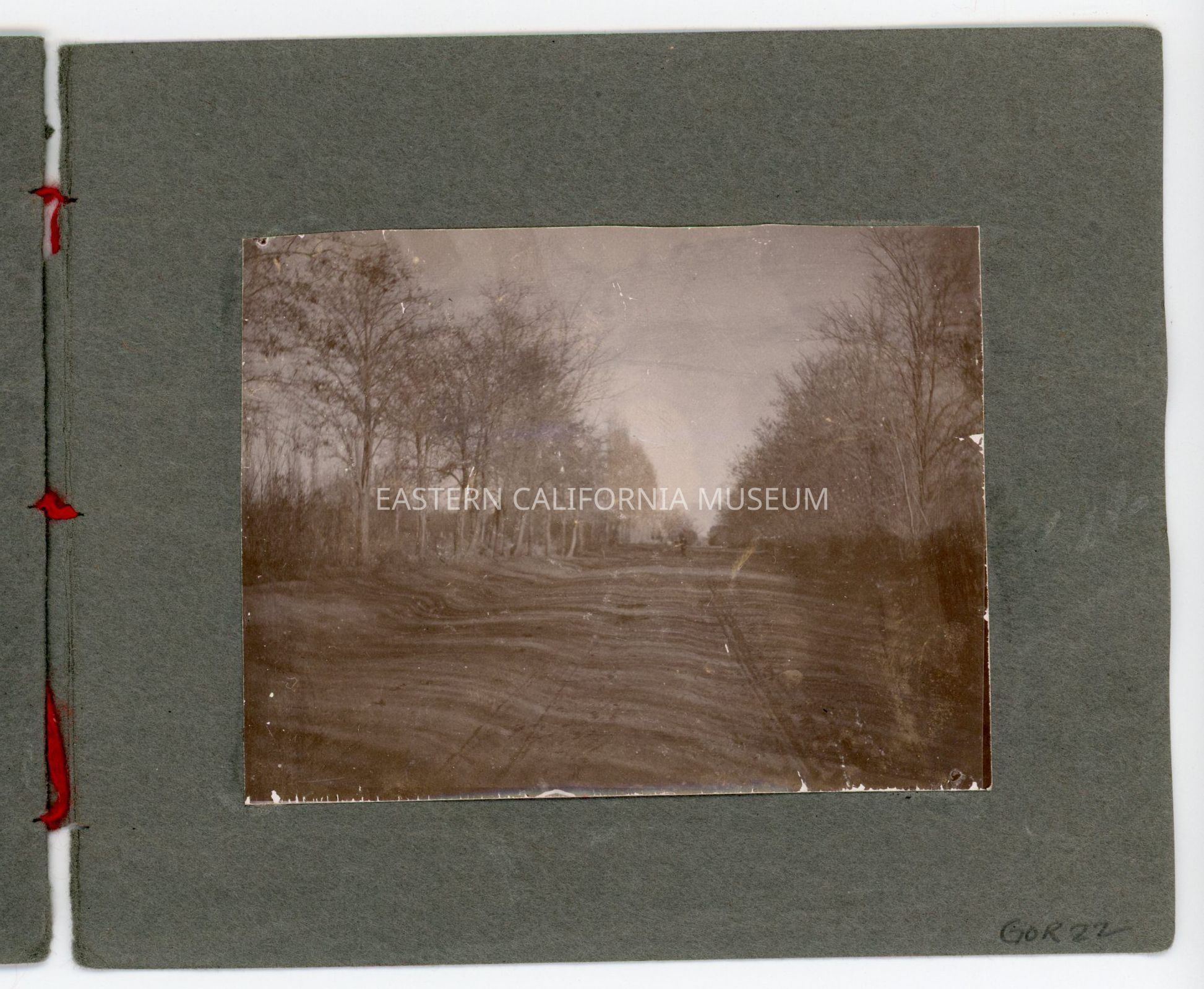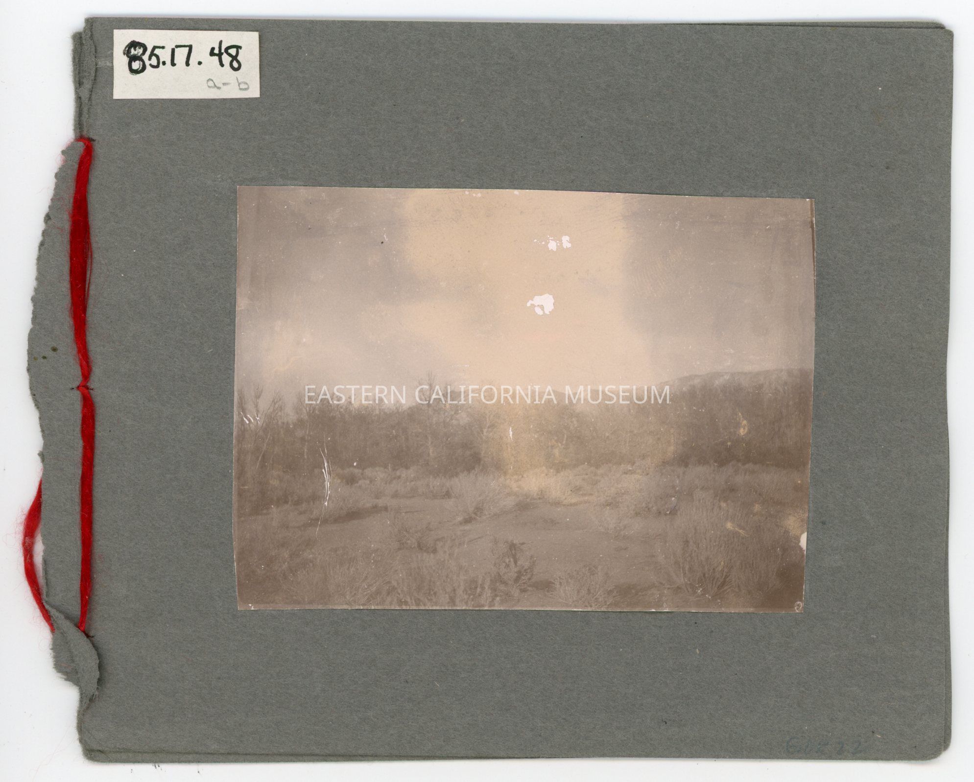 Two photos torn out of an album or scrapbook of Gorman Ranch at Fort Independence. 1985.17.48a--Field 1985.17.48b--Dirt road