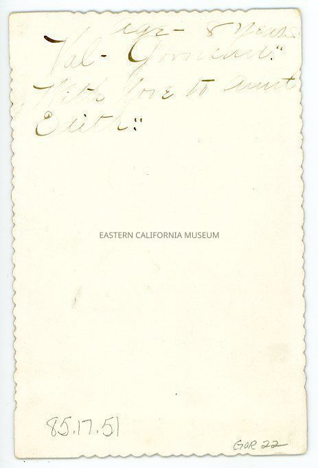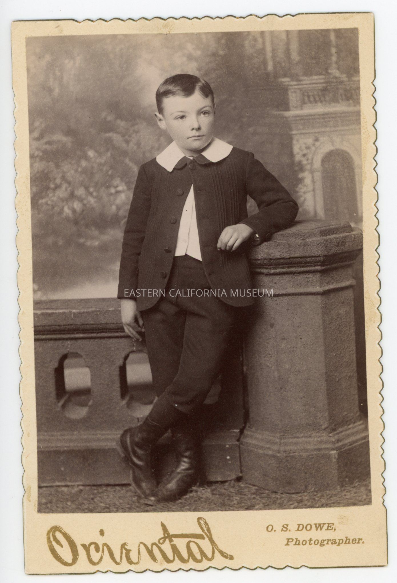 Mounted studio portrait of Val Gorman as a young boy. Photographer was O. S. Dowe of the Oriental Studio.