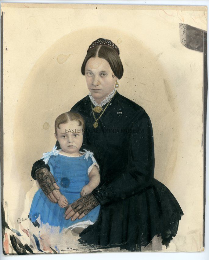Mounted photograph of an unidentified woman dressed in black holding a small child wearing a blue dress. The photo has been tinted or painted. The woman is wearing an elaborate headpiece, a white lace collar, black fingerless gloves, large gold earrings, a gold brooch, and a gold necklace. The word "Blue" is written in lower left near the child's dress. Donor said this item came from the Deeter house in Bishop on West Line St. (Jack Renlund lives in house as of 1973.)