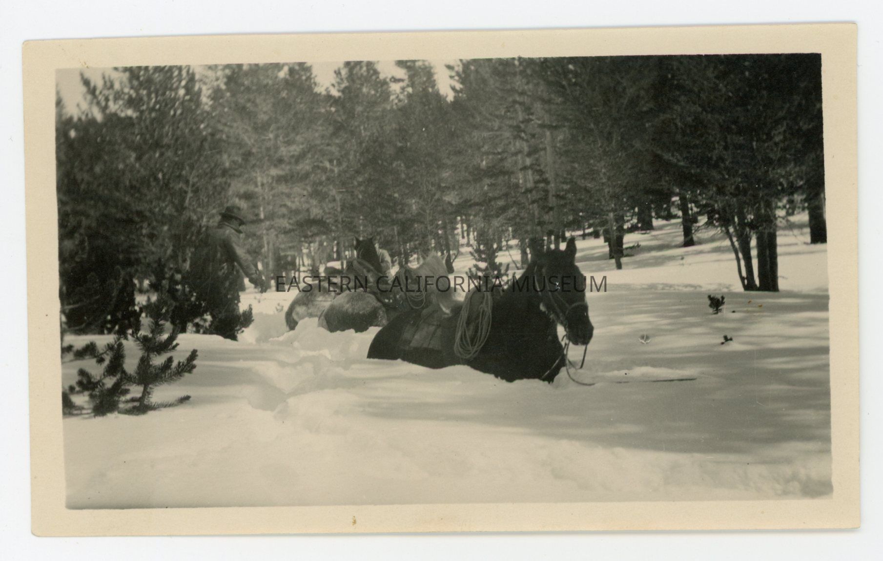 Photo of three horses chest deep in snow. There is a man standing to the left next to some trees.