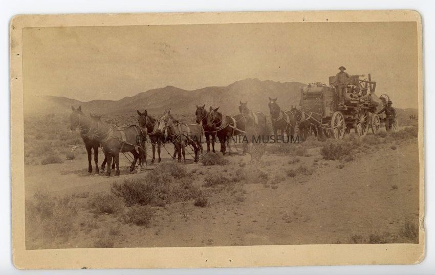 Mounted photograph of two men, a loaded wagon or stagecoach, and a team of nine or ten horses on a dirt road in the desert. Mountains in background.