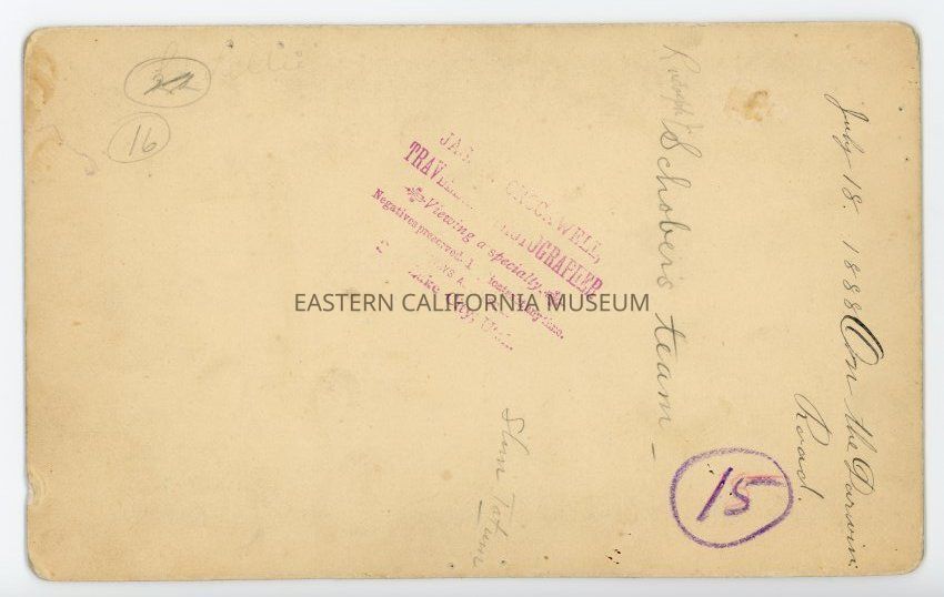 "July 18, 1888, on the Darwin Road." "Rudolph Schober's team." "Slim Tatum." Stamped with photographer's information on reverse: Jas. Crockwell, Travelling Photographer. Viewing a specialty. Negatives preserved...Salt Lake City, Utah.Made/Created