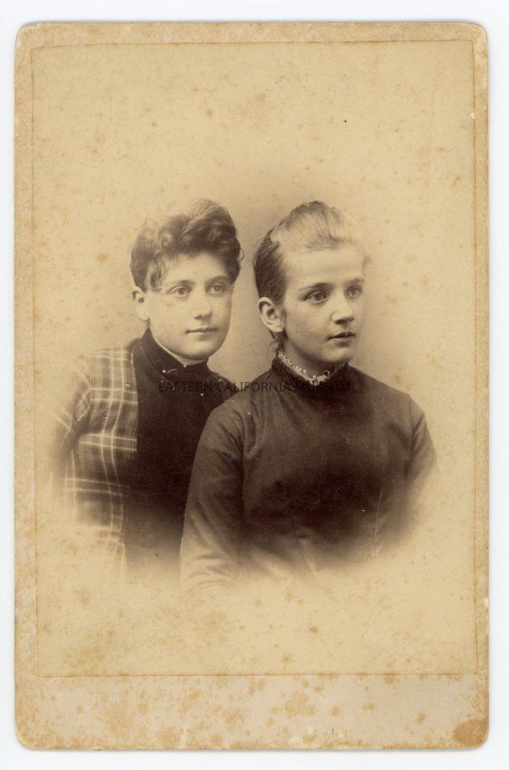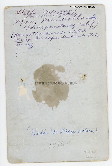 Mounted studio portrait of Estella [Stella?] Meysan of Lone Pine and Mary Mulholland of Independence. Mary's father owned and edited the Inyo Independent and Stella's father owned a general store in Lone Pine. Photographer was Jas. Crockwell.Made/Created