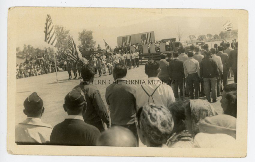 Black and white photo of an outdoor Memorial Day event at Manzanar War Relocation Center in 1942. There is a band (drums visible), stage, crowd, and many American flags.