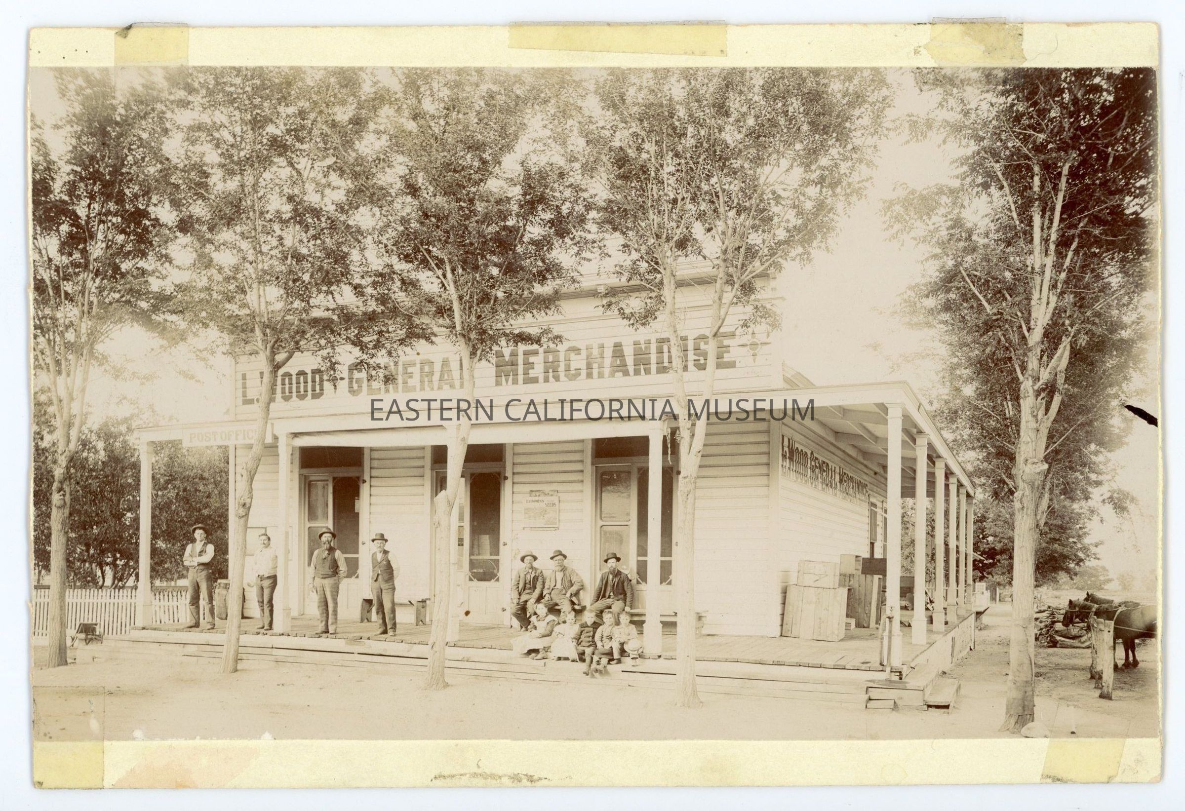 Mounted photo of the L. Wood General Merchandise store in Independence. The Post Office also appears to have been housed in this building. There are seven men in the photo and five young children sitting on the edge of the wrap-around wood porch. George Wood, then a young man, and Mr. Wood Sr. are in this photo.
